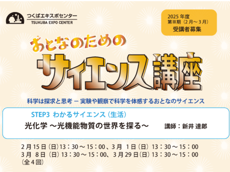 第1回 2月15日(日) 身近な光化学 第2回 3月1日(日) 光化学(物質の構造と化学変化)第3回 3月8日(日) 色と発光(蛍、サイリューム、ルミノール発光など)第4回 3月29日(日) 光エネルギーと物質の機能